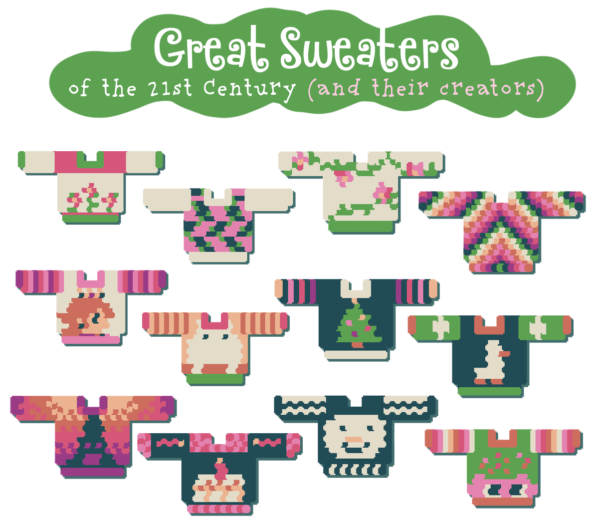 From Feburary to March of 2026 I ran a tiny competition for folks to make their best sweater. these are the ones I liked the most! thank you to everyone who participated